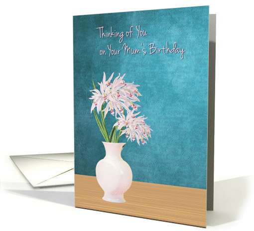| Artist Notes: | Send this beautiful card to someone you know who has lost her mum. This remembrance card on her mum's birthday has light pink orchids in a white vase. The background is a rich blue. |