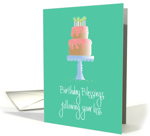 "Birthday Blessings following your loss" is the beautifully hand lettered wording of white, on this touching card that celebrates the first birthday someone bereaved after a personal loss is experiencing. A tall, round cake with two layers, frosted in pink, at the card's center, adds a touch of birthday celebration to the card, while the inside wording encourages with the wording "Wishing you a birthday filled with the quiet joy that comes from knowing that friends are thinking about you, care about you and love you."