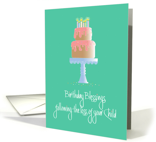When a Parent has tragically lost a Child and is now having their first birthday following this loss, this beautiful card will say not only Happy Birthday to them, it will let them know all of the support that surrounds them. The lovely hand lettered wording says "Birthday Blessings following the loss of your Child". Above the words, a tall Birthday cake, topped with candles, adds color and celebration to the teal colored card. Your inside words are heartfelt and touching with the message "Birthday wishes to you, at this difficult time of loss. Wishing you a birthday filled with the quiet joy that comes from knowing that friends are thinking about you, care about you and love you."