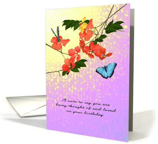 | Artist Notes: | This birthday card conveys a message to someone who is going through a first birthday alone and bereaved, having lost a partner. The design shows colorful butterflies visiting a spray of beautiful bright orange flowers. The background is a mottled pattern in soft shades of yellow and purple. |