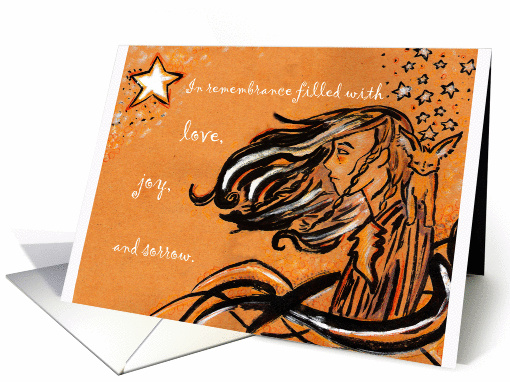 | Artist Notes: | Originally painted with Sumi Ink, and colored with colored pencils. When dealing with the loss of child, their day of birth can be a difficult reminder of their death. This card shows your love and support in memory of that loss, and a reminder of all the joy that child brought to the lives they touched. |