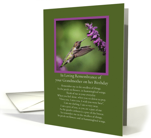 | Artist Notes: | Remembering grandmother on her birthday. A card with a beautiful nature scene of a hummingbird and a poem about thinking of someone that has passed. A beautiful way to remember. |