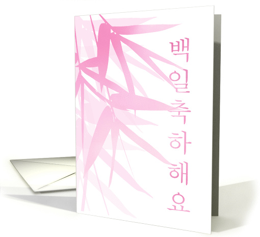 Celebrate a precious milestone with this soft and elegant Korean Baek-il card. Featuring delicate pink watercolor bamboo leaves and vertical Hangul calligraphy "백일 축하해요," that translates to "Congratulations on 100 Days!", this design honors baby’s first 100 days with warmth and grace. A beautiful way to mark this cherished tradition with a gentle, feminine touch.