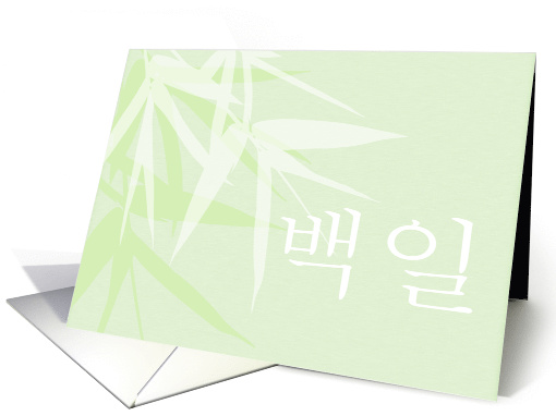 Celebrate a significant early milestone with this exquisite Baek Il card, featuring a calming green and white bamboo leaf motif. This design brings a refreshing, natural elegance to the cherished 100-day celebration. The Hangul writing on the front of the card, "백일," (백 일) translates to "100 Days" or "Baek Il," clearly marking this special Korean tradition.