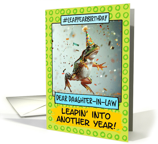 | Artist Notes: | A festive frog is jumping for joy in between the confetti, wearing a party hat on a green background with a circle pattern and the text 'dear daughter-in-law leapin' into another year!'. A fun card to send to your special daughter-in-law for their birthday. |