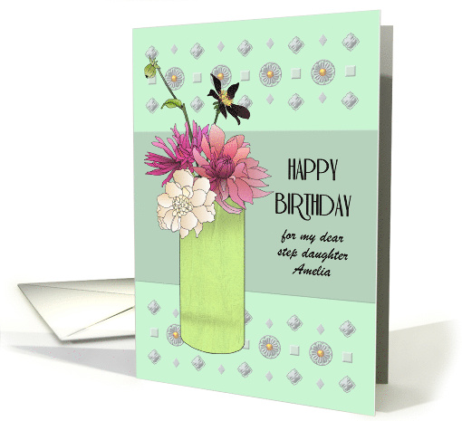 | Artist Notes: | Birthday wishes for a step daughter. This design features a vase of pretty flowers in shades of pink. The vase is a translucent soft green color. The background is a color block in soft blue-green and grey, with three rows of grey geometric patterns running along the upper and lower edge of the card. This design is customizable for the relation and name; a step daughter in this example. |