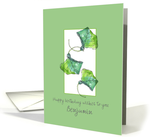 | Artist Notes: | Happy birthday greetings decorated with three summer leaves hand drawn with ink and watercolor on a white rectangle on a warm green background. Personalize the card with the special birthday recipient's name and special message inside. |