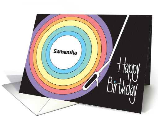 "Happy Birthday" is white hand lettered wording that fits into the lower right corner of this colorful birthday card with the recipient's name on it. Perfect for any age, the younger people of today have gone back to listening to their favorite tunes on a record player, just like their grandparents and parents did. The round record on the card is filled with a rainbow of colors that range from lavender to blue and all colors in between, with an outlined white record player's arm on top of the record. The bright colors of the record pop out of the dark background with celebration and festivity! At the center of the record, where the record label normally sits, is an area where you type in the name of the person you are sending your card to and who is celebrating their birthday. Just follow the prompts, while ordering, to insert their name on the middle of the record. The inside wording of the card says "Spinning birthday wishes your way for a wonderful birthday!"