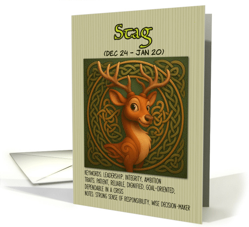 This is a Celtic zodiac card for the Stag, covering the period from December 24 to January 20. Archetype: The Leader and Pathfinder Symbol of renewal, vision, and sovereignty. The stag represents purpose, dignity, and the drive to build and lead. It's the sign of those who blaze new trails and set noble examples. According to this Celtic zodiac system, people born under the Stag sign embody leadership, integrity, and ambition. Their key traits include being patient, reliable, dignified, and goal-oriented, with the notable quality of being dependable during times of crisis. The card emphasizes that Stag individuals possess a strong sense of responsibility and are characterized as wise decision-makers. The stag symbol is particularly fitting for these attributes, as deer are often associated with nobility, grace, and quiet strength in Celtic mythology. The timing of this sign, spanning the winter solstice and New Year period, aligns with themes of leadership and new beginnings.