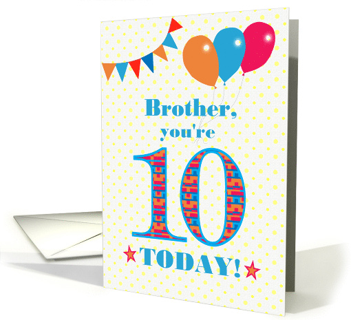 A colourful birthday card for a 10-year-old brother, with the large number 10 filled with an orange, red and blue pattern, outlined in bright blue. There are balloons and bunting at the top, in matching colours and the front cover greeting is, 'Brother, you're 10 today!' in bright blue lettering, on a very pale yellow and white polka dot background, with red and orange stars each side of the word 'TODAY!'. The inside message can easily be customized or deleted if you wish.