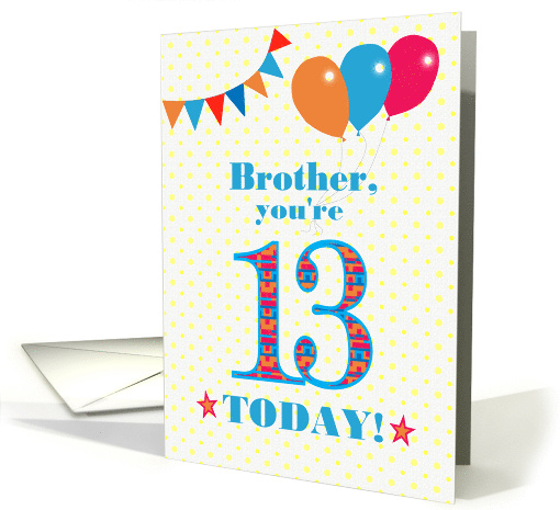 A colourful thirteenth birthday card for your brother, with the large number 13 filled with an orange, red and blue pattern, outlined in bright blue. There are balloons and bunting at the top, in matching colours and the front cover greeting is, 'Brother, you're 13 today!' in bright blue lettering, on a very pale yellow and white polka dot background, with red and orange stars each side of the word 'TODAY!'. The inside message can easily be customized or deleted if you wish.