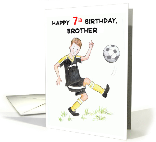 A 7th Birthday Card for a Brother, with a boy enjoying playing football (soccer), from a watercolour illustration by Judy Adamson. The boy is wearing his team's black and yellow strip, which says 'Champ' on the front and he is kicking a football. The text on the front cover is, 'HAPPY 7th BIRTHDAY, BROTHER', in black lettering with the age picked out in bright red.