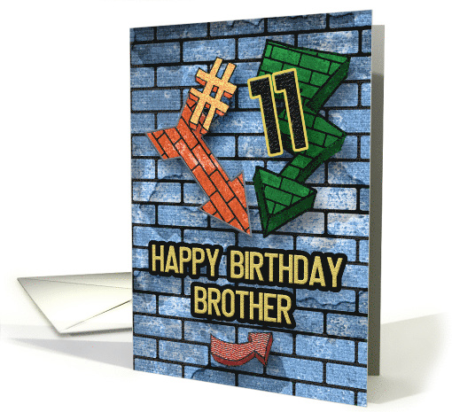 Give your brother this bold and colorful Happy 11th Birthday greeting that features a digitally created brick wall effect, big colorful arrows, and a number sign. THE COVER OF THIS CARD HAS BEEN DESIGNED INTENTIONALLY TO HAVE A GRUNGY AGED WORN LOOK.