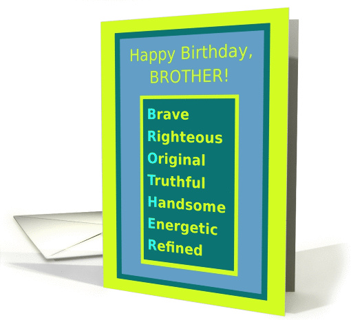 | Artist Notes: | Everyone loves a compliment and a laugh. This is an acrostic card wherein the first letter of each compliment spells brother when all put together. Change inner text from big to little, step, foster or half brother if that works for you. |