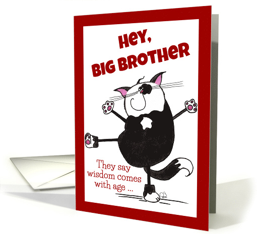 | Artist Notes: | ©Christie Black. A black and white cartoon cat stands on his hind legs, kicks one out to the side and spreads his arms out. Caption says, "They say wisdom comes with age ..." and inside refers to him being a show off. Funny birthday card for someone getting older. |