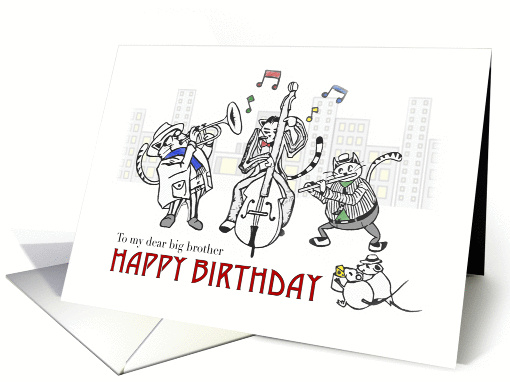 | Artist Notes: | This birthday card for a big / older brother features three groovy cats playing jazz music on the streets of the big city. There are two mice listening to the music. The card features the text "To my dear big brother, Happy birthday" on the front. |