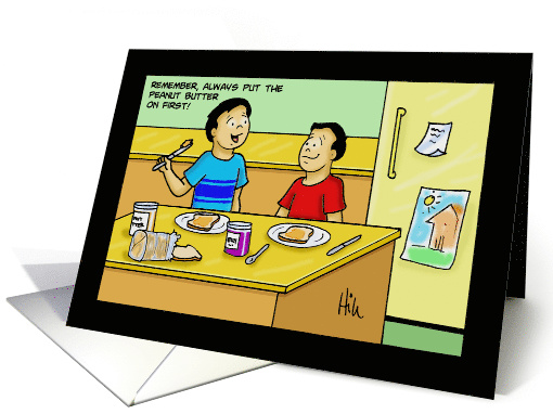Birthday card for a brother from a brother. The cartoon shows two boys in the kitchen making peanut butter and jelly sandwiches. The older boy says, Remember, always put the peanut butter on first! Inside says, Happy Birthday, Bro!