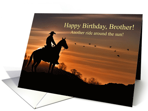 A brother birthday card with a silhouetted country western scene of a cowboy on horseback at sunset in the great outdoors.