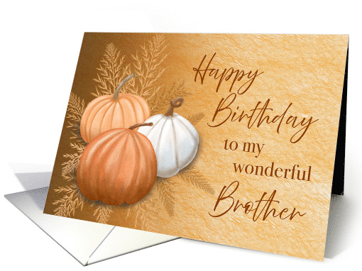 Celebrate your brother born during the autumn season with this beautiful watercolor pumpkin card. A trio of orange and white pumpkins stand out colorfully on this faux textured orange/brown background and the verse reads: "Happy birthday to my wonderful brother." Your sibling will thank you for remembering his special day!