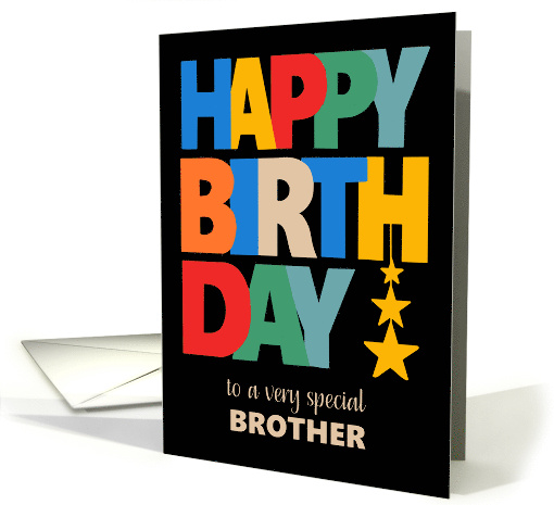 A brightly coloured Birthday Card for your brother. The front cover greeting is 'HAPPY BIRTHDAY' in very large capital letters in bold colours, split into three lines, with a row of yellow stars in different sizes hanging from the 'H' at the end of 'BIRTH' in the space after, 'DAY'. Below the giant letters, the greeting reads, 'to a very special BROTHER'. The black background will print best if you choose the 'glossy' option and the inside message is just a suggestion and you can easily personalise that as well as the front cover, if you wish.