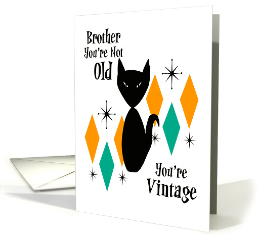Give your brother this humorous birthday card with a vintage Mid-Century Modern design that includes starbursts, colorful diamonds, and a black cat on his birthday. A fun way to let him know that he's vintage, not old!