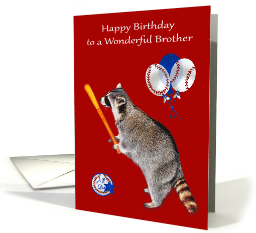 | Title: | Birthday to Brother, raccoon with a baseball bat on red with balloons |
