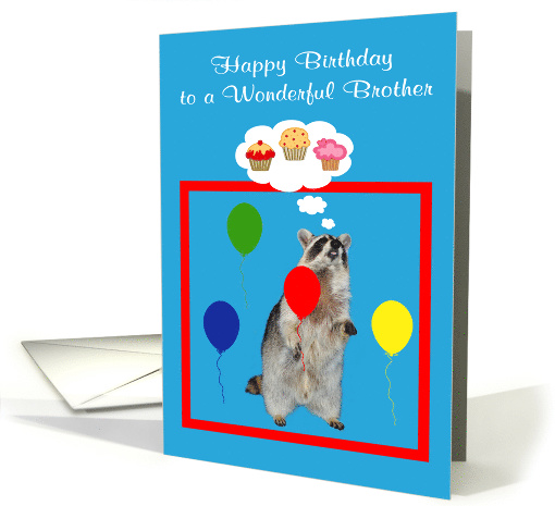 Say Happy Birthday to a wonderful brother with an adorable raccoon, Bullwinkle wishing for cupcakes holding a balloon. The background is a pretty blue with a red frame and balloons.