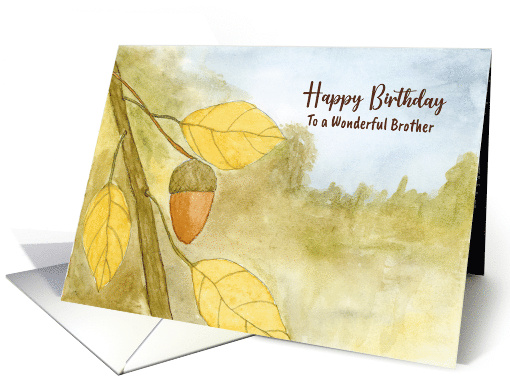 Send a beautiful birthday card featuring this watercolor picture of an acorn and leaves on a soft Autumnal backdrop to a dear Brother. Earth tones and pastel shades were used to create this illustration.