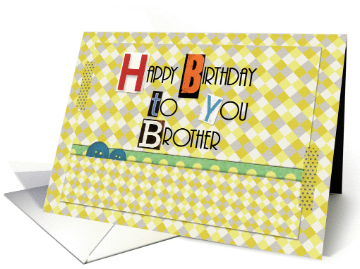 Say Happy Birthday Brother with this fun scrapbook style design that features magazine cutout effect letters on a bright and bold yellow plaid background.All elements are digital, not actual magazine cutouts.Original design by Betsy Bush,Birthday Cards Cafe'.