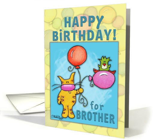Happy Birthday for Brother-Cat and Bird with Balloons