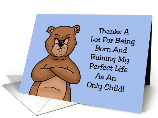 Humorous Birthday card for a brother, with a cartoon bear on a blue background. The words say: Thanks a lot for being born and ruining my perfect life as an only child! Inside says: Sorry, I meant to say Happy Birthday Bro
