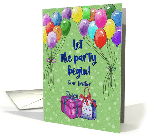 A cheerful birthday card with a green background covered in soft polka dots. At the top, a cluster of colorful watercolor balloons tied with bows floats above the bold hand-lettered phrase “Let the party begin!” in vibrant blue. At the bottom, two gift boxes — one in bright pink with a blue ribbon and another polka-dotted with a red bow — complete the festive composition. A fun and joyful design for any celebration. Brother