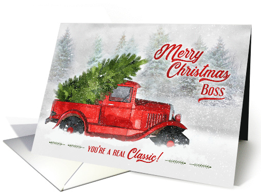 | Artist Notes: | Fun Christmas greeting for the boss who loves vintage vehicles. A red antique truck with a cut tree for Christmas sits on a wintry path in a woodland area covered in snow for a seasonal holiday. |