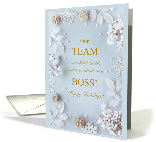 | Artist Notes: | A pale winter blue background framed with winter white and gold leafy bits, berries, snowflakes and pine cones to pair with a message of; "Our team wouldn't be the same without you, Boss!" Simple, elegant and perfect for male or female management. |