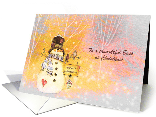| Artist Notes: | A pastel colored illustration of a handsome Snowman standing in front of a row of white winter trees holding a wood sign that has a birdhouse dangling from it. The sign has customizable text - as does the whole card front and inside. A couple of wild birds rest on his arm. He wears a big Top Hat that also has a bird sitting on it. His attire is a soft warm scarf and a few patch hearts on himself too.. Shown is to a Boss or Employer - Manager for the Christmas Season - holidays but you can alter it to say whatever you prefer to anyone you like. |