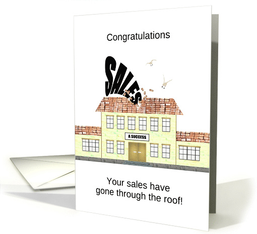 A congratulations card for a company whose sales have gone through the roof. For this design, we have the word 'SALES' breaking through the roof of an office building. Two birds are seen taking off from the roof in a hurry.