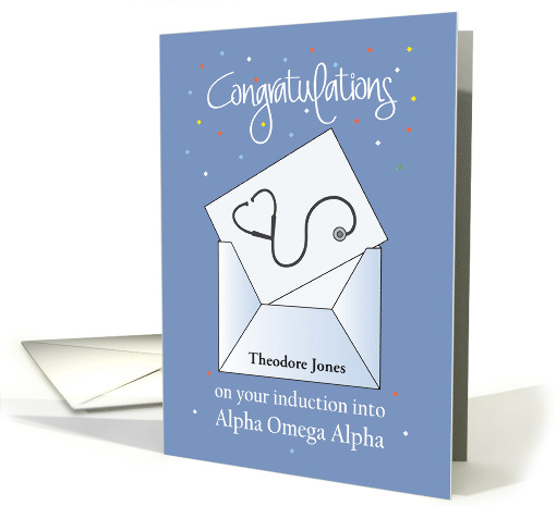 Receiving the honor of induction into the Honor Medical Society, Alpha Omega Alpha, is one of the highest honors a Medical Student can attain. Congratulate those who receive this great award by sharing this personalized card with them. The wording says "Congratulations on your induction to Alpha Omega Alpha" with an open envelope that is overlapped by a stethoscope. There is an area on the base of the envelope for you to enter the recipient's name, as you order their card, making the card a keepsake they will treasure. The card's inside wording says "Congratulations on your inauguration into the Honor Medical Society. Best wishes for continued success in your career."