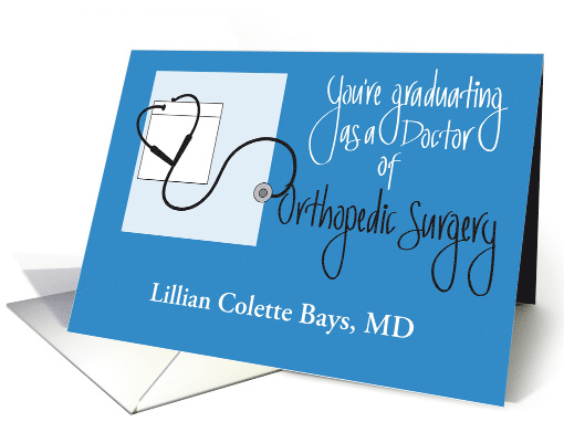 "You're graduating as a Doctor of Orthopedic Surgery" is the congratulatory wording hand lettered across the right side of this very special card that congratulates the recent graduate from medical school in the specialty of Orthopedic Surgery. A stethoscope winds its way across the left side, in black, on a white pocket, filling the left side with medical imagery. Across the bottom, is an area where you can type the graduate's name, personalizing the card for them. The card's inside wording says "Congratulations and best wishes for continued success in your career as an Orthopedic Surgeon."