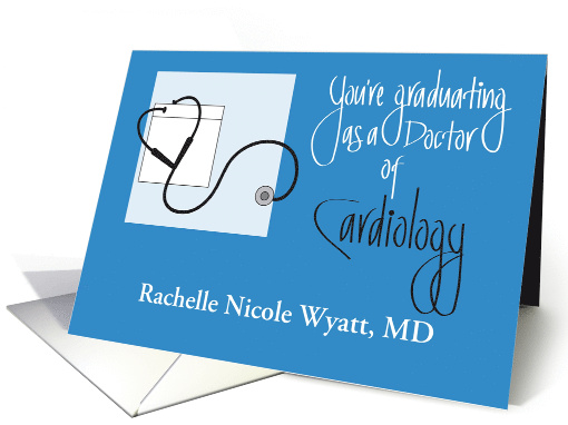 Congratulate a new graduate, who has just earned the certification and completed the courses necessary to become a Doctor of Cardiology, by sharing this blue hand lettered card with them. The hand lettered wording says "You're graduating as a Doctor of Cardiology", lettered in both white and black, at the card's right side. Balancing out the right side's wording is an image of a square white Doctor's pocket with a black stethoscope, an instrument the new Cardiologist will soon be using daily. The bottom of the card provides an area for you to personalize the card with the new Doctor's name. The inside wording of this lovely congratulatory card is "Congratulations and best wishes for continued success in your career as a Cardiologist."