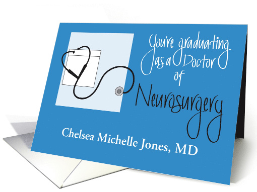 This elegant Graduation Congratulations card is a wonderful way to congratulate the new graduate of Medical School, who has specialized in the field of Neurosurgery. The card contains an image of a white Doctor's pocket, on a large white square, with a black undulating stethoscope extending from the pocket. The wording of the card, to the image's right, is gracefully hand lettered in white with the words "You're graduating as a Doctor of Neurosurgery". Below the stethoscope and wording, a line provides a spot for you to type in the graduate's name to customize the card with their personal name. The card's inside wording is "Congratulations and best wishes for continued success in your career as a Neurosurgeon."