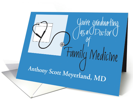 Congratulate and show you appreciate all the hard work of the recent graduate who has just completed their study in Medical School's Specialized Area of Family Medicine, by giving them this special Graduation card. The words on the blue card are artistically hand lettered, in white, "You're graduating as a Doctor of Family Medicine". The words "Family Medicine" are accentuated, with their black color. Above these words are two images that will look familiar to the new Doctor, a stethoscope and a partial view of what their Doctor's coat looks like. The bottom of the card is reserved for the name of the graduate, which you type in as you order their card. The inside wording is "Congratulations and best wishes for continued success in your career as a Doctor of Family Medicine."