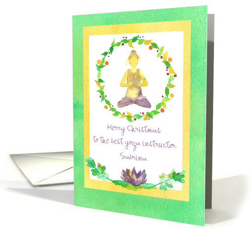 | Artist Notes: | A custom Merry Christmas card for your favorite yoga instructor decorated with a woman in the lotus pose inside a holiday wreath. Mistletoe and a purple lotus flower, symbols for spiritual growth and transformation. |