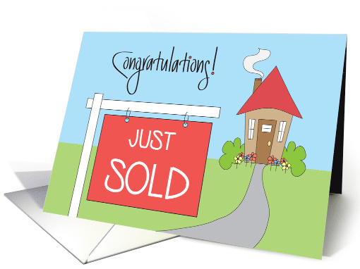 This fun card is the perfect way for a Real Estate Company or a fellow Realtor to congratulate Realtors following their sales of a listed properties. The card will congratulate a Realtor, on their recent sale of a home, as shown with the large red "Just Sold" sign in the foreground, along a gray pathway leading to a red roofed cottage, in the distance. The hand lettered wording, above the "Just Sold" sign says "Congratulations!", in beautiful black hand lettering. On the inside of the card, the realtor is told "Congratulations on your recent sale!"