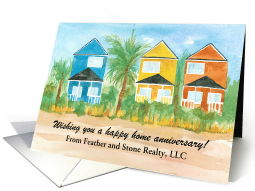 | Artist Notes: | A greeting card for a first home anniversary from a realtor. The card design features colorful beach houses in yellow, orange, and blue with a smooth sandy beach and palm trees waving in the breeze. |