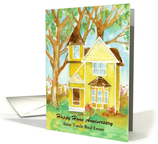 | Artist Notes: | A real estate card to send to your clients for their first anniversary of owning their new home featuring a yellow Victorian style two-story house with a little white cat in the bay window and soft pink flowers climbing around the picket fence illustrated with watercolor. |