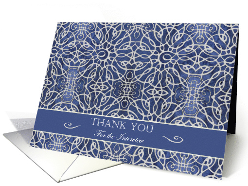 Business / corporate Thank You For the Interview, paper greeting card. Color theme:Blue, gray, silver. Theme:Art Nouveau, classic, elegant design with thin interconnected lines.