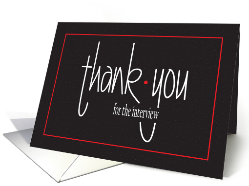 Whether you have just graduated from College and are now interviewing for your very first professional job, or you wish to change jobs or careers and have had an interview for a new position, this thank you for the interview card is the perfect way to stay in touch with those you have interviewed with, to keep your name in their minds. They will be delighted with this card's elegant and stunning white hand lettering that pops out from the black background, with small red accents. The card's inside wording says "Thanks so much for meeting with me to discuss opportunities with your company."