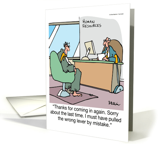 Business job interview. A man at his second interview, looks a little worse for wear as he sits on a trap door, across from the man holding the job interview who sits behind a desk – which has a lever on the side of it. The job interviewer says, Thanks for coming in again. Sorry about the last time. I must've pulled the wrong lever by mistake. Inside reads, Thank you for the interview. Hope I make it to the second round. Don't tell them you've got a good sense of humor, show them – and throw in a thank you to show them you appreciate their time. Thank you for checking out my greeting cards. More cards: http://www.greetingcarduniverse.com/community/store.asp?store_id=2337&gcu=42744787710&mid=cwu Cornered Books at: https://www.amazon.com/-/e/B007G2B9BO My daily cartoon: https://www.gocomics.com/cornered