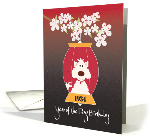 Celebrate the birthday of someone born in the year 1934, by sharing this fun Chinese Zodiac card with them. Instead of celebrating the number of years old this person now is, this fun card celebrates the Chinese Zodiac sign they were born under and the year they were born in. A delightful white dog fills a red paper Chinese lantern that is suspended from a blossoming white cherry blossom branch. His lantern contains the year of "1934" on its base, in black numbers. Below the lantern and dog are the elegantly hand lettered words, in white, "Year of the Dog Birthday". Your inside wording to the birthday celebrant is "Wishing you a birthday filled with joy and happiness."
