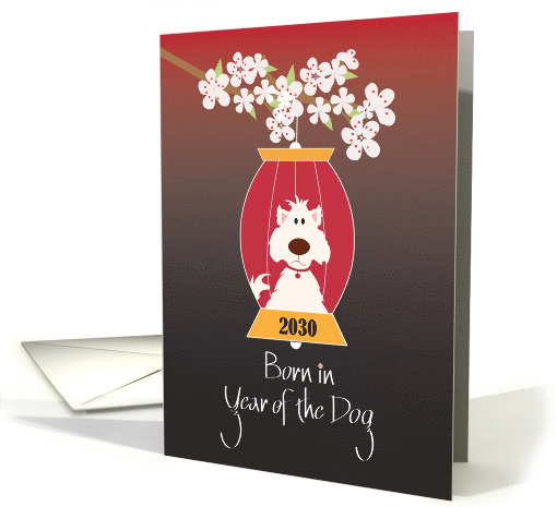 "Born in the Year of the Dog" is the oriental design hand lettering at the bottom of this Chinese New Year Birthday card for someone born in the Year of the Dog. This delightful white dog wants to help you say Happy Birthday to someone very special, who is born in the year 2030, the Chinese Year of the Dog. A fluffy white dog decorates the hanging red Chinese lantern that hangs below a branch overflowing with white cherry blossoms. What a lovely card to share on someone's birthday. The inside wording of the card is "Wishing you a birthday filled with joy and happiness."